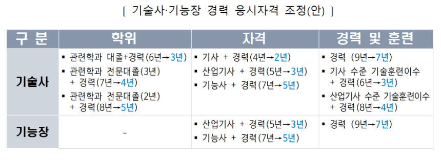 정부는 우선 기술사·기능장 시험 응시를 위한 경력 요건을 2~4년 단축하기로 했다. 기술사 기준 기존 최대 9년이던 경력 요건이 7년 수준으로 낮아지고, 기사 취득 후 필요한 경력도 4년에서 2년으로 줄어든다. 기능장 역시 산업기사 취득 후 경력 요건이 5년에서 3년으로 완화된다.