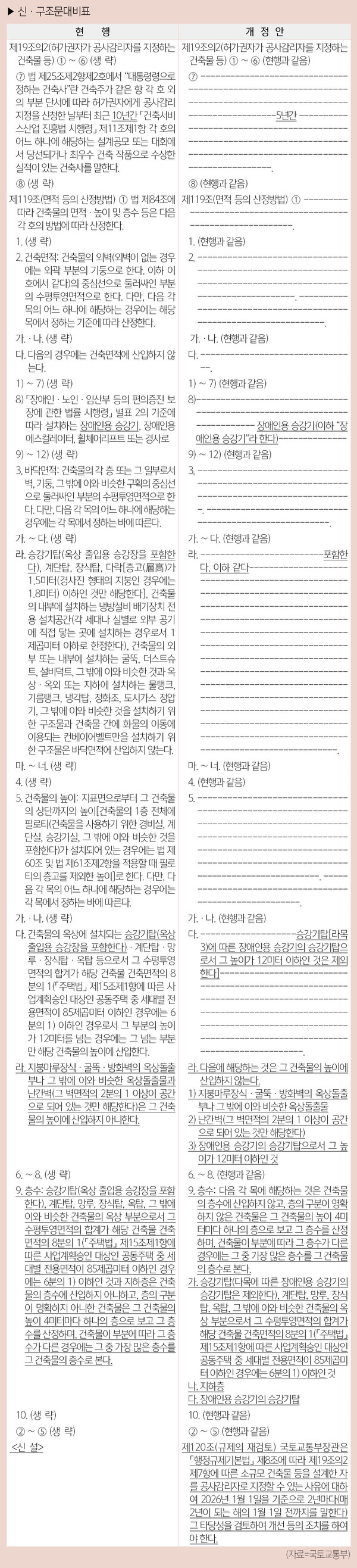 장애인용 승강기의 승강기탑의 경우 종전에는 그 수평투영면적을 합산해 해당 건축물의 건축면적의 8분의 1 이하인 경우에만 건축물의 층수에 산입하지 않았지만, 앞으로는 그 수평투영면적과 관계없이 건축물의 층수에 산입하지 않는다.