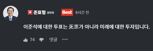 홍 전 시장의 지지자가 이러한 내용을 청년의꿈에 공유하자 홍 전 시장은 “이 후보에 대한 투표는 사표가 아니라 미래에 대한 투자”라고 반박에 나선 셈이다.