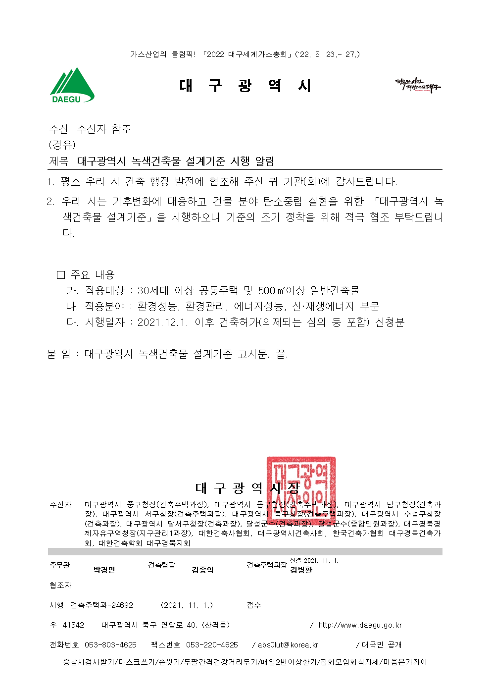 대구광역시 녹색건축물 설계기준 시행 알림