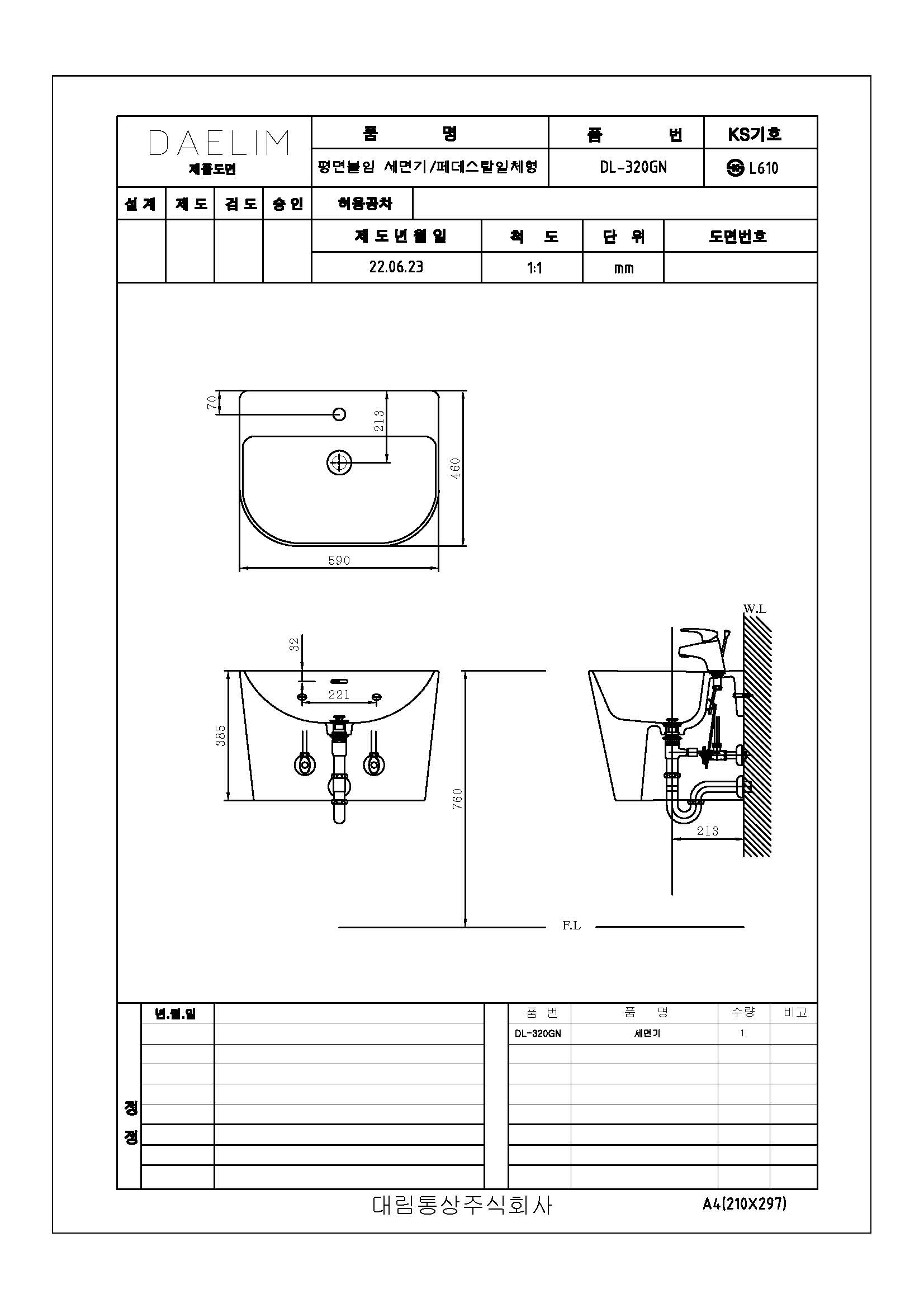 도비도스 일체형 평면 붙임 세면기 DL-320