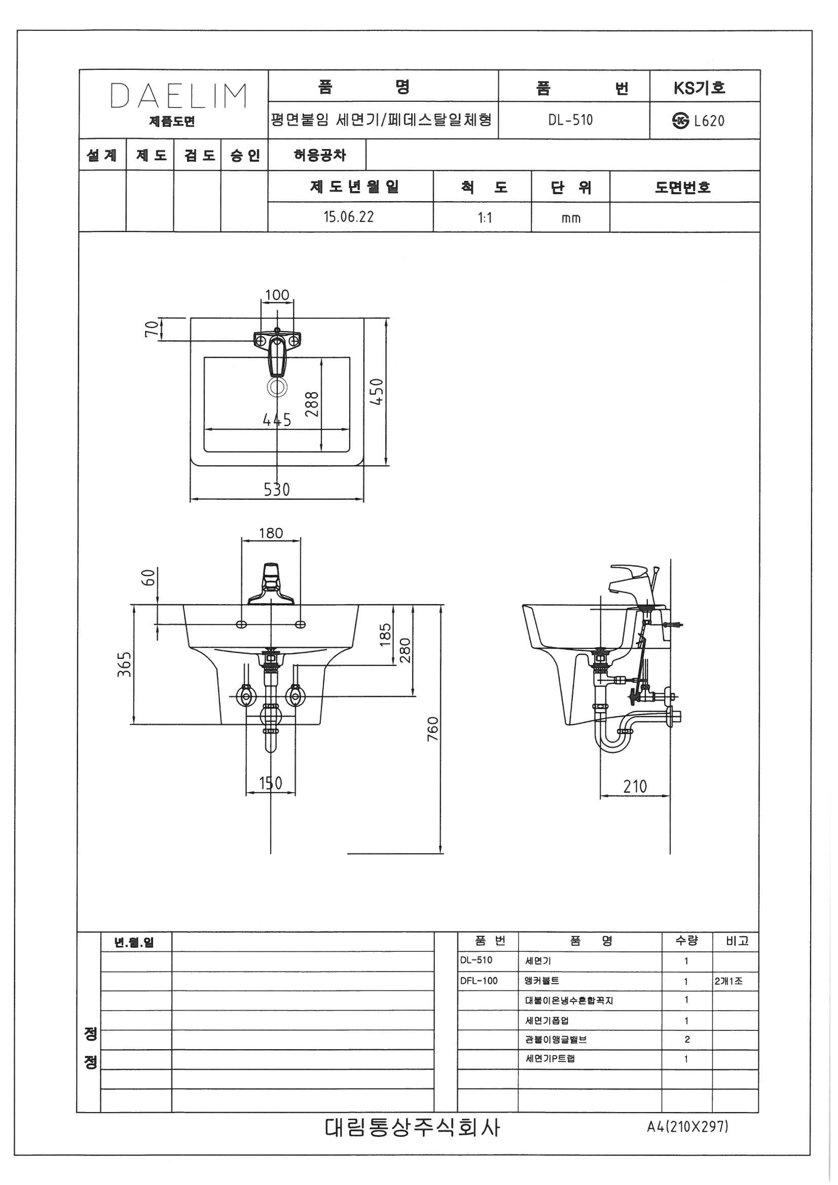 도비도스 일체형 평면 붙임 세면기 DL-510