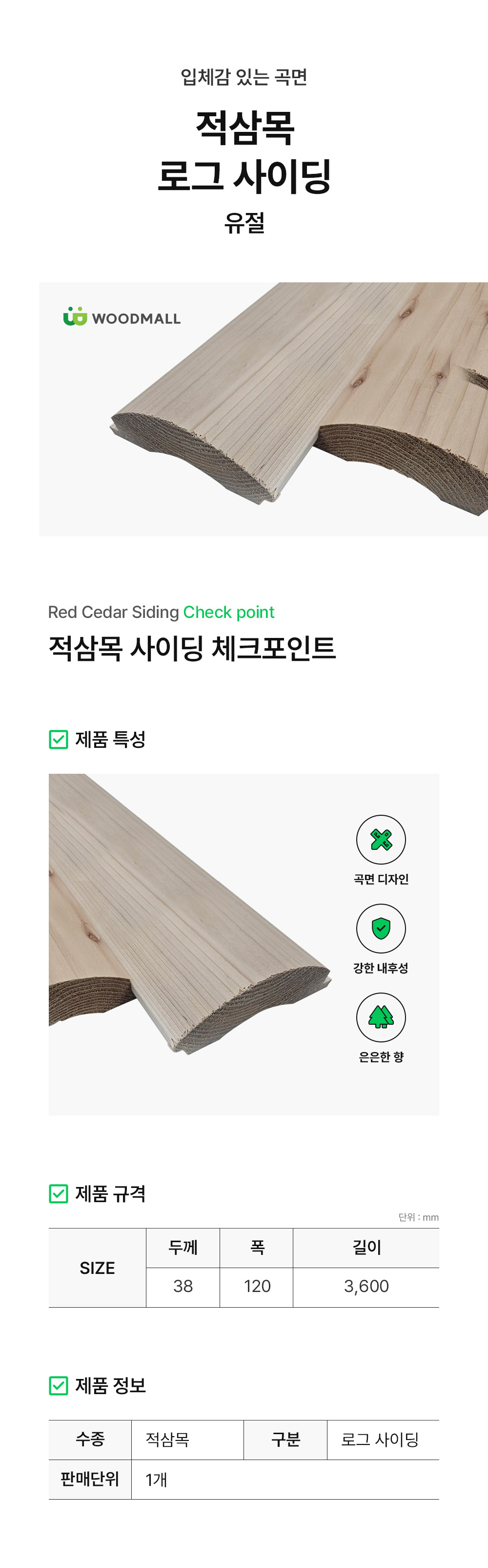 북미산 적삼목 유절 로그사이딩 38x120x2400