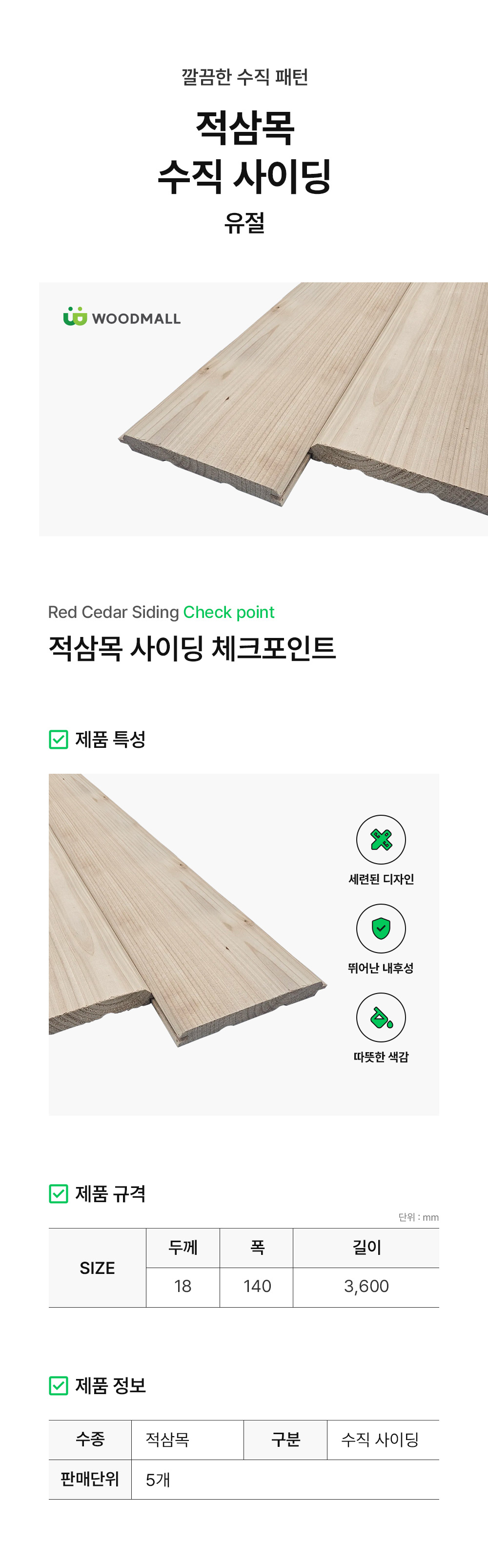 북미산 적삼목 유절 수직사이딩 (5개묶음) 18x140x2400