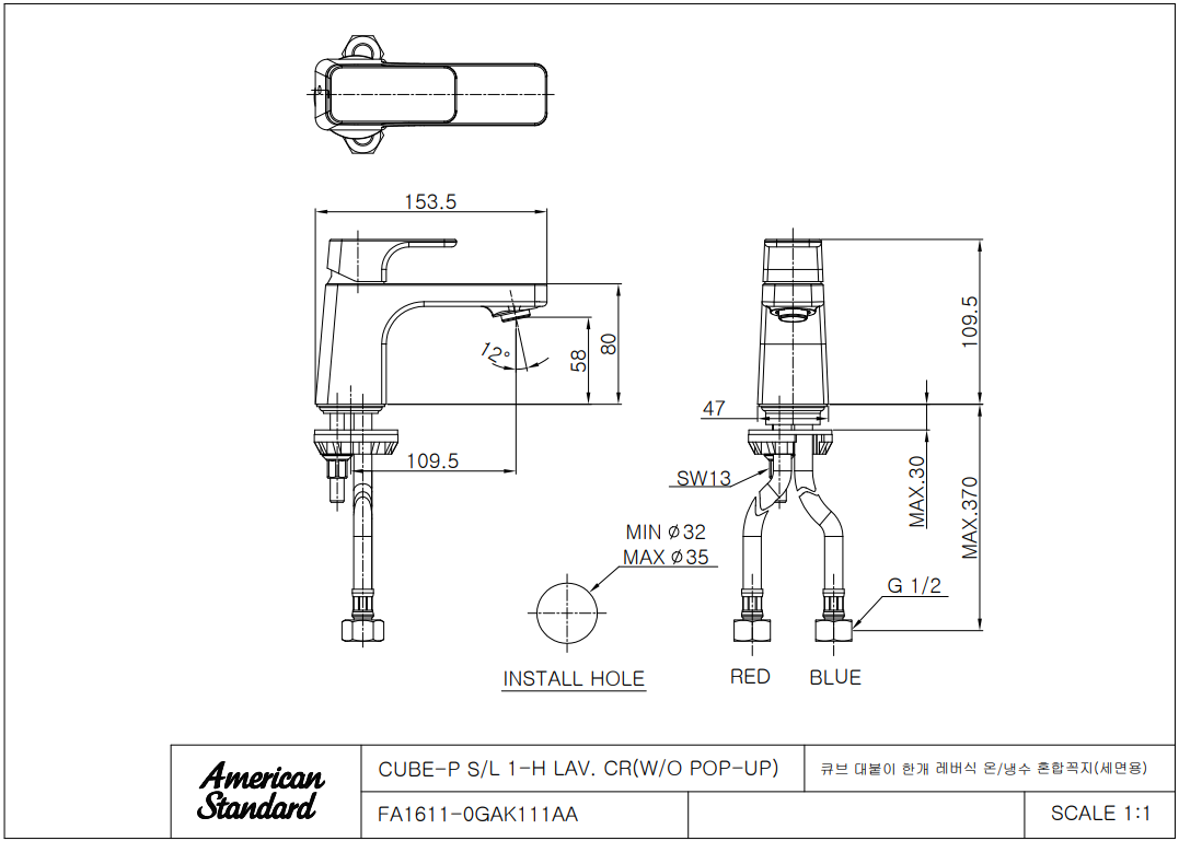 아메리칸 스탠다드 CUBE-P 1H 큐브 P 세면수전