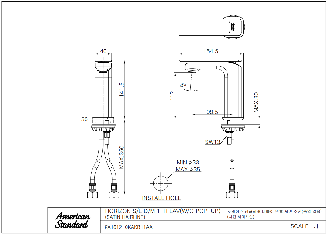 아메리칸 스탠다드 HORIZON 1H 호라이즌 세면 수전 (사틴 헤어라인)