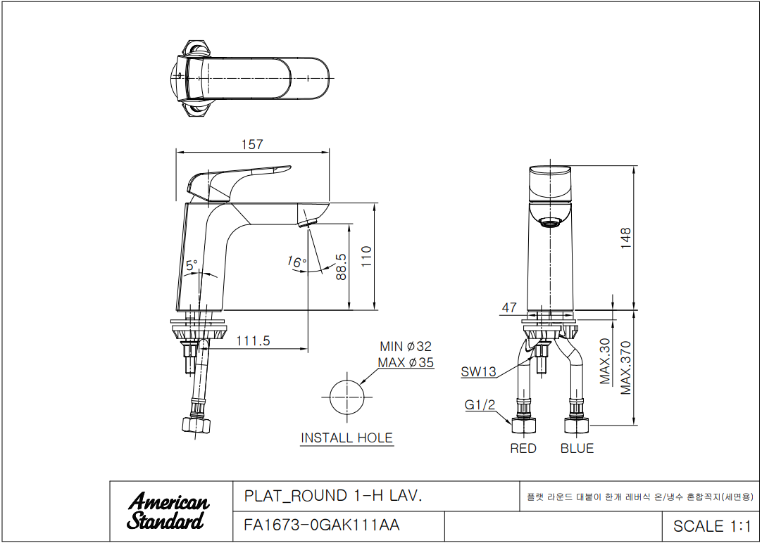 아메리칸 스탠다드 PLAT ROUND 1H 플랫 라운드 세면수전