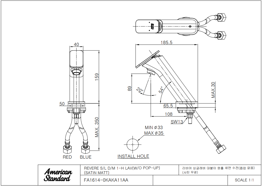 아메리칸 스탠다드 REVERE 1H 리비어 세면수전 (사틴 무광)