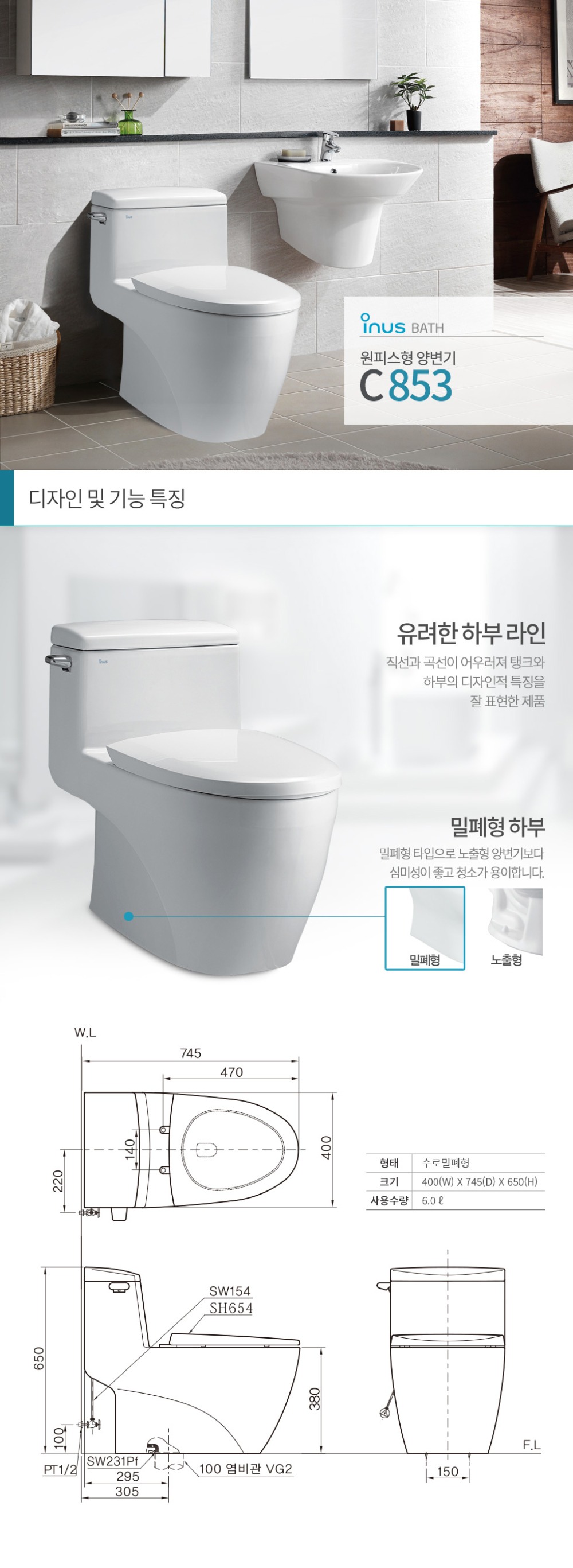 이누스 C853P 절수형 원피스 양변기 (부속 및 시트포함)