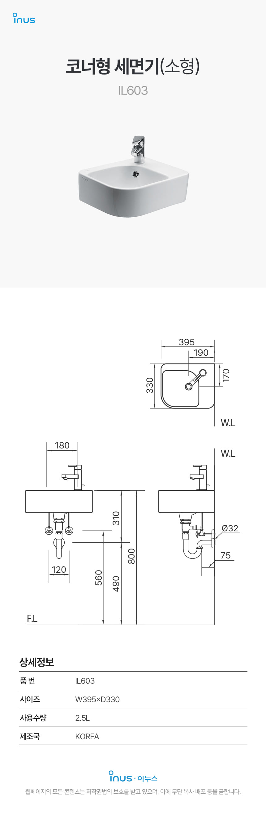 이누스 IL603 소형 코너형 세면기 (수전, 부속 별도)