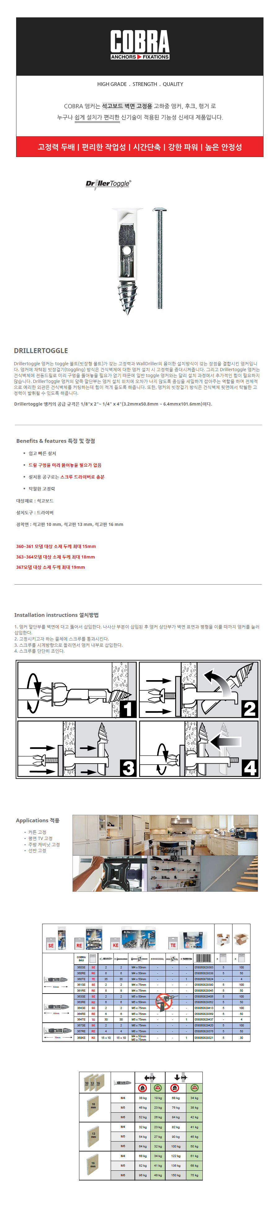 코브라앙카 석고앙카 드릴러토글 361SE M4x75mm 2개입