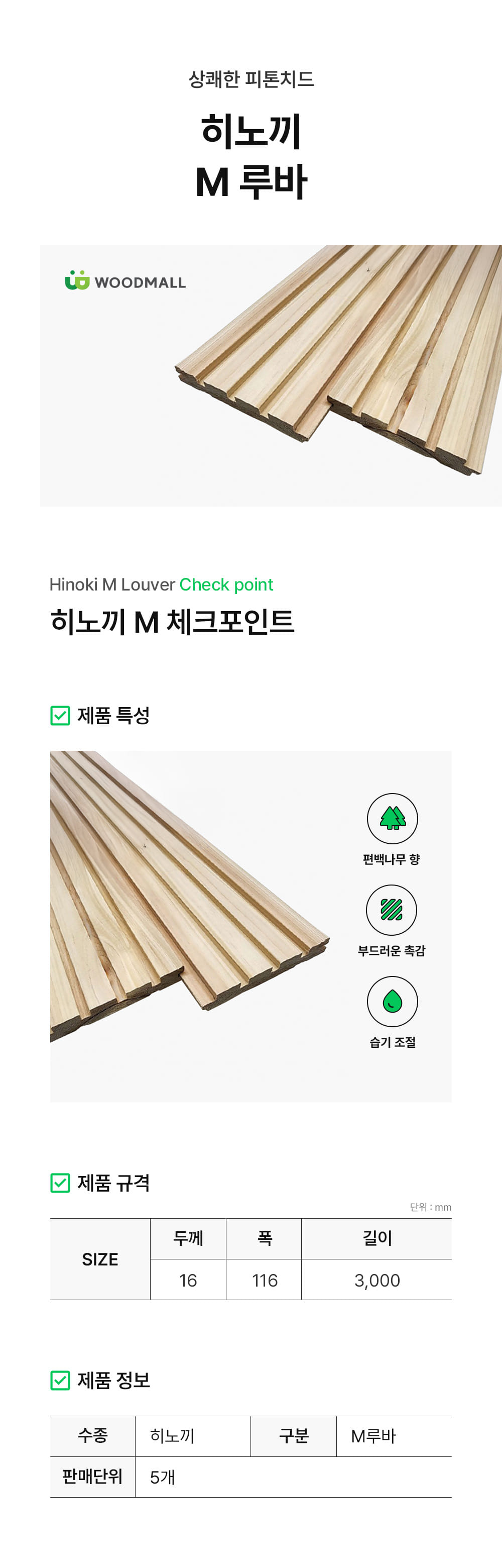 편백(히노끼) M루바 (5개묶음) 16x116x3000